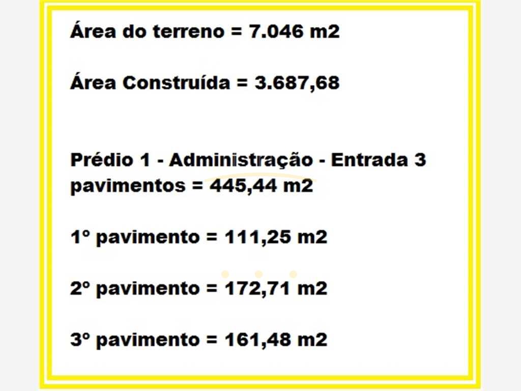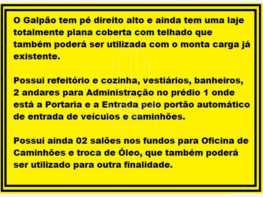 Área do terreno: 7046,00 m², Área construída: 3687,00 m², Ótima Localização, O Galpão tem pé direito alto e ainda tem uma laje totalmente plana coberta com telhado que também poderá ser utilizada com o monta carga já existente.