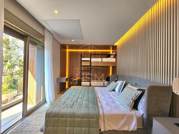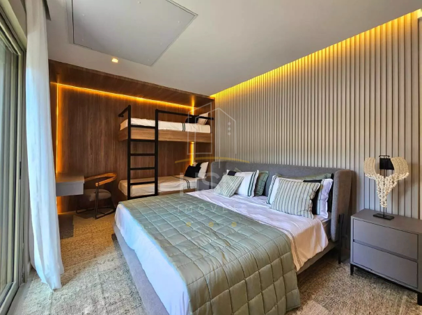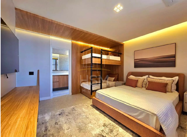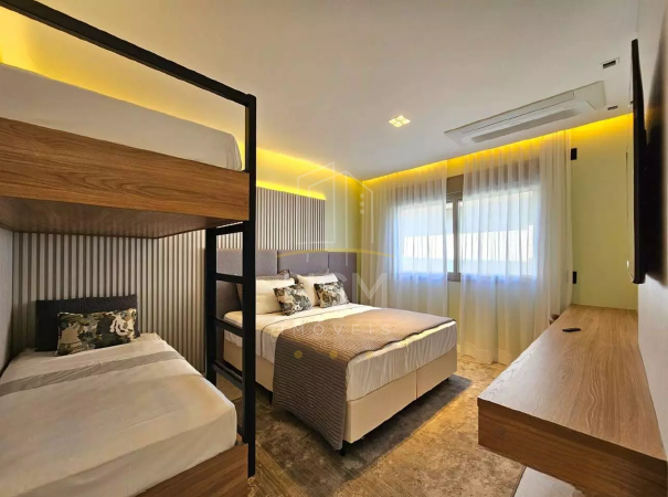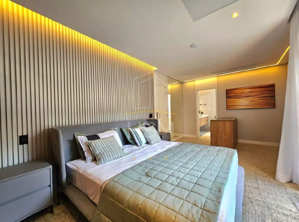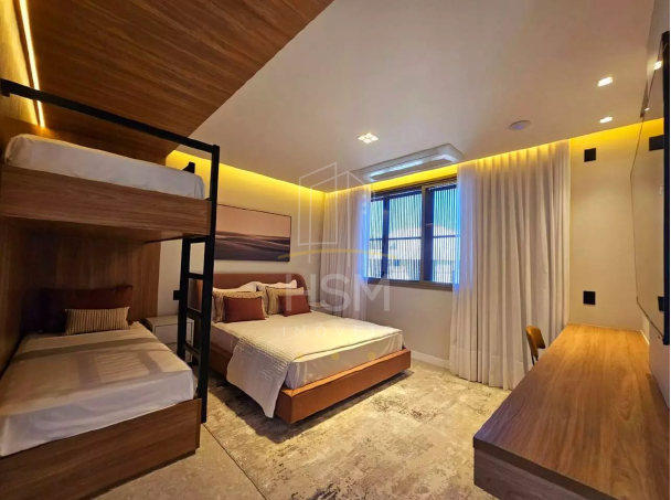 04 suítes amplas, todas com marcenaria sob medida, guarda-roupas, enxoval completo, tapetes e TVs Samsung 4K de 55”