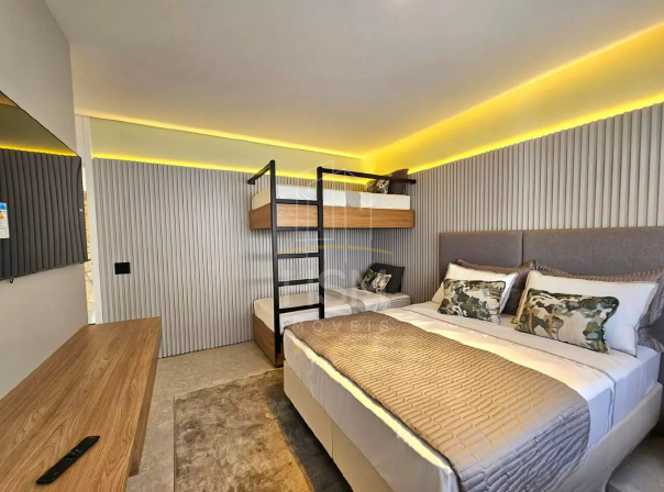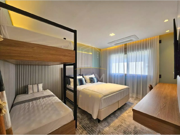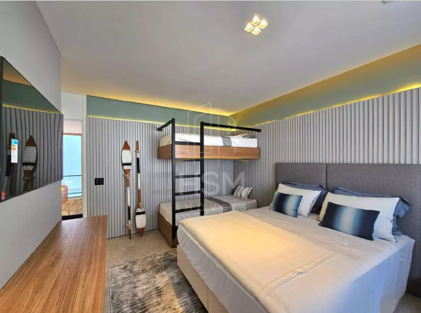 Todas as suítes contam com cama de casal e beliche em marcenaria exclusiva