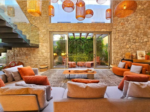 Sala de estar com pé-direito duplo, revestimento em pedra moledo e atmosfera imponente