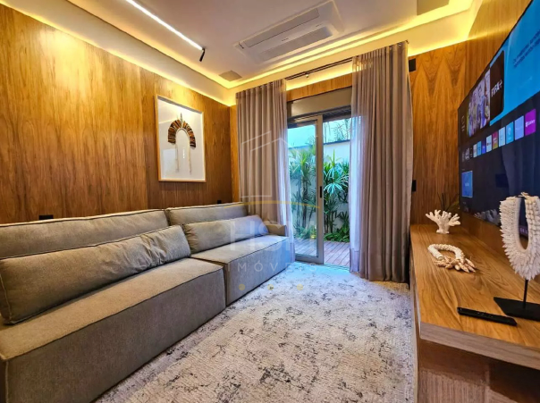Home theater reversível para suíte, equipado com sofá retrátil, TV de 75” e banheiro completo